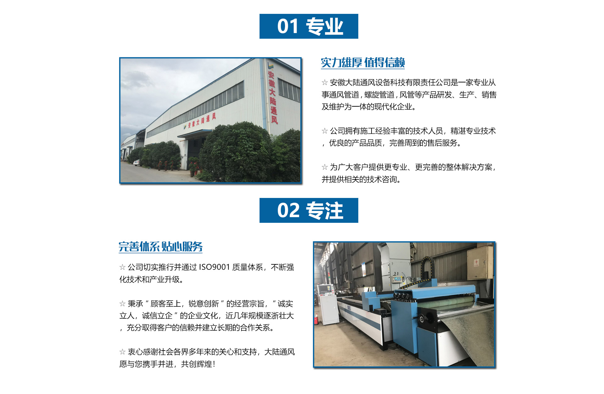 安徽大陸通風(fēng)設(shè)備科技有限責(zé)任公司加工共板法蘭風(fēng)管、螺旋風(fēng)管、角鐵法蘭風(fēng)管、插接式風(fēng)管。價(jià)格合理。質(zhì)量保障。是國內(nèi)生產(chǎn)和研究通風(fēng)管道的企業(yè),工廠坐落于經(jīng)濟(jì)發(fā)達(dá)的安徽省合肥市。公司配備了好的自動(dòng)化流水線設(shè)備和先進(jìn)的制作安裝技術(shù)。